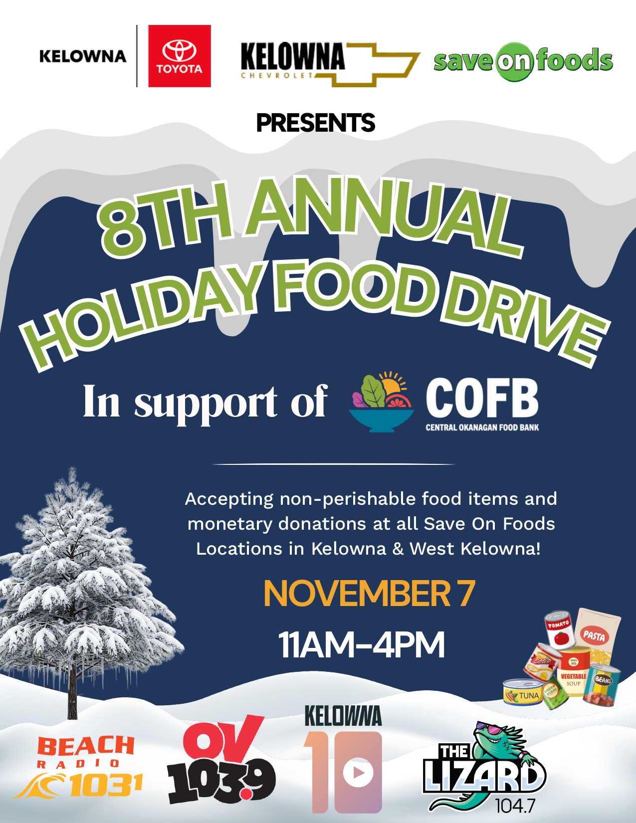 Join us for the 8th Annual Holiday Food Drive presented by Kelowna Toyota, Kelowna Chevrolet, Saveonfoods, Beach Radio 103.1, OV 103. 9, The Lizard 104.7, Kelowna 10 on November 7th from 11AM to 4PM at all Save On Foods locations in Kelowna and West Kelowna! This beloved community event brings together neighbors, families, and local