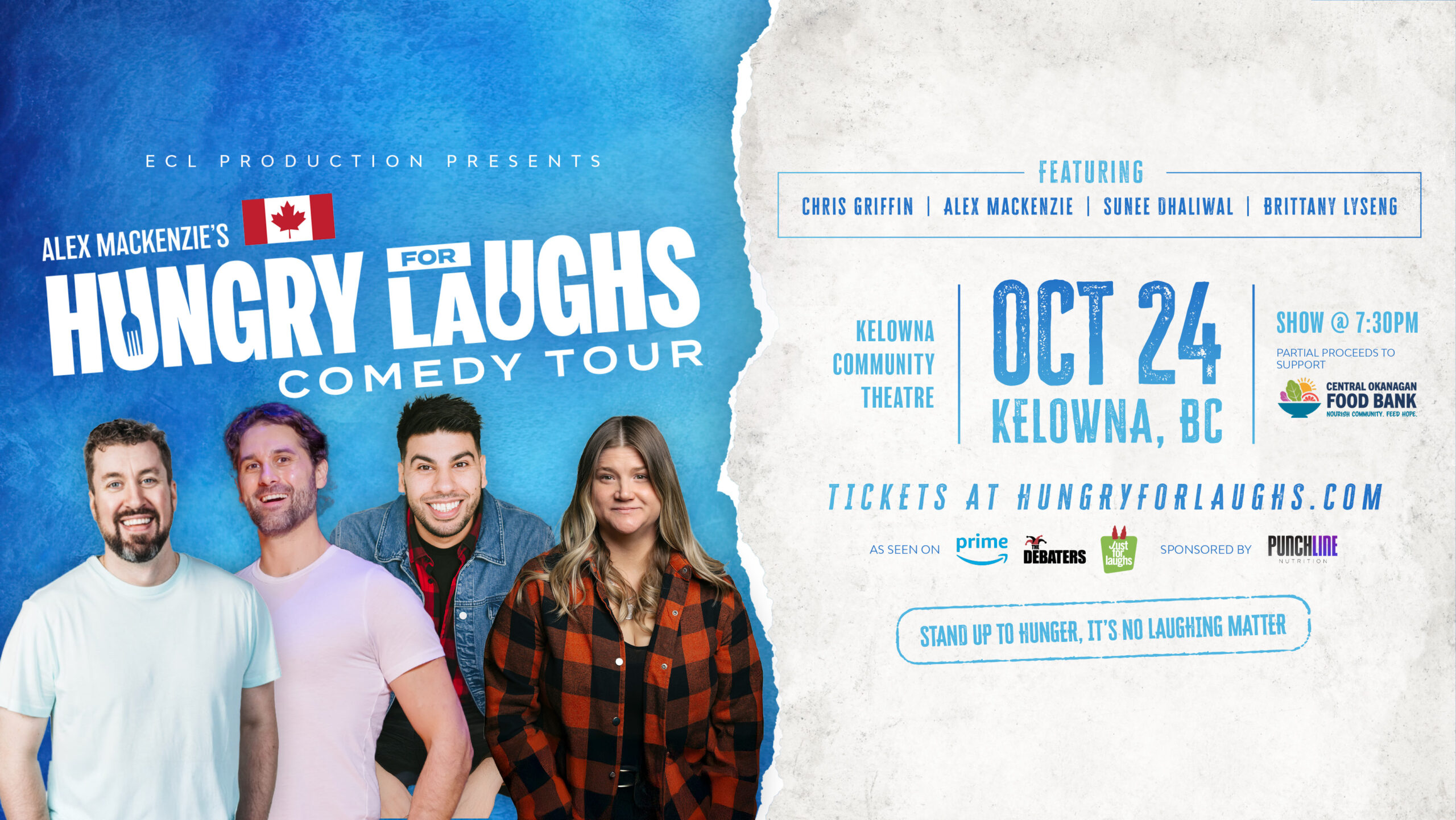Stand Up to Hunger with Chris Griffin, Alex Mackenzie, Sunee Dhaliwal and Brittany Lyseng at the Hungry for Laughs Comedy Tour stop in Kelowna on Oct 24th! Taking place at the Kelowna Community Theatre, starting at 7:30pm with partial proceeds to support the Central Okanagan Food Bank.
