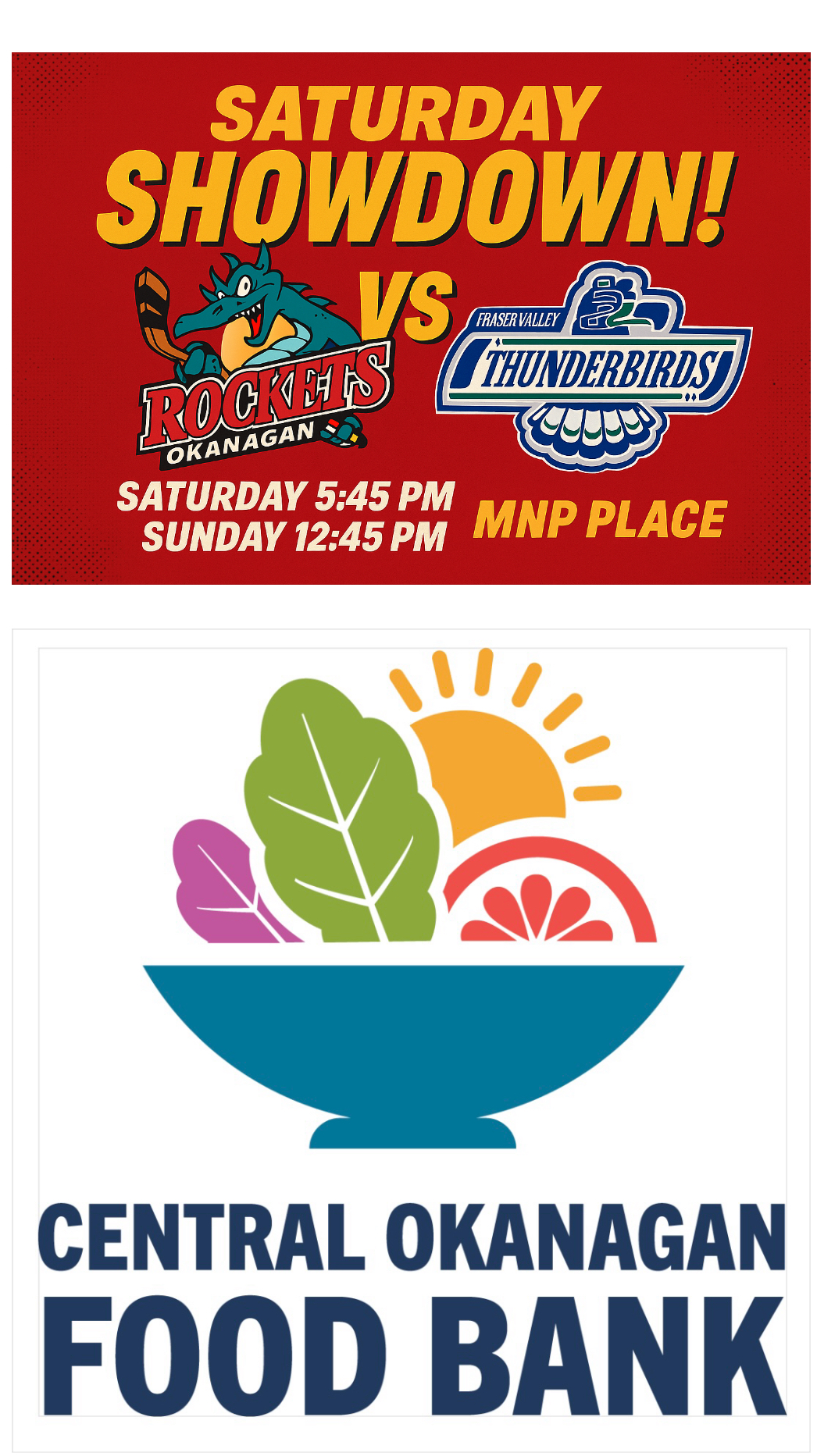 🚨 Support Local Talent & Give Back! 🚨 Come cheer on the Okanagan Rockets and bring a non-perishable food item for the Central Okanagan Food Bank. 🎟 FREE EVENT πŸ“ Join us, show your community pride, and make an impact!