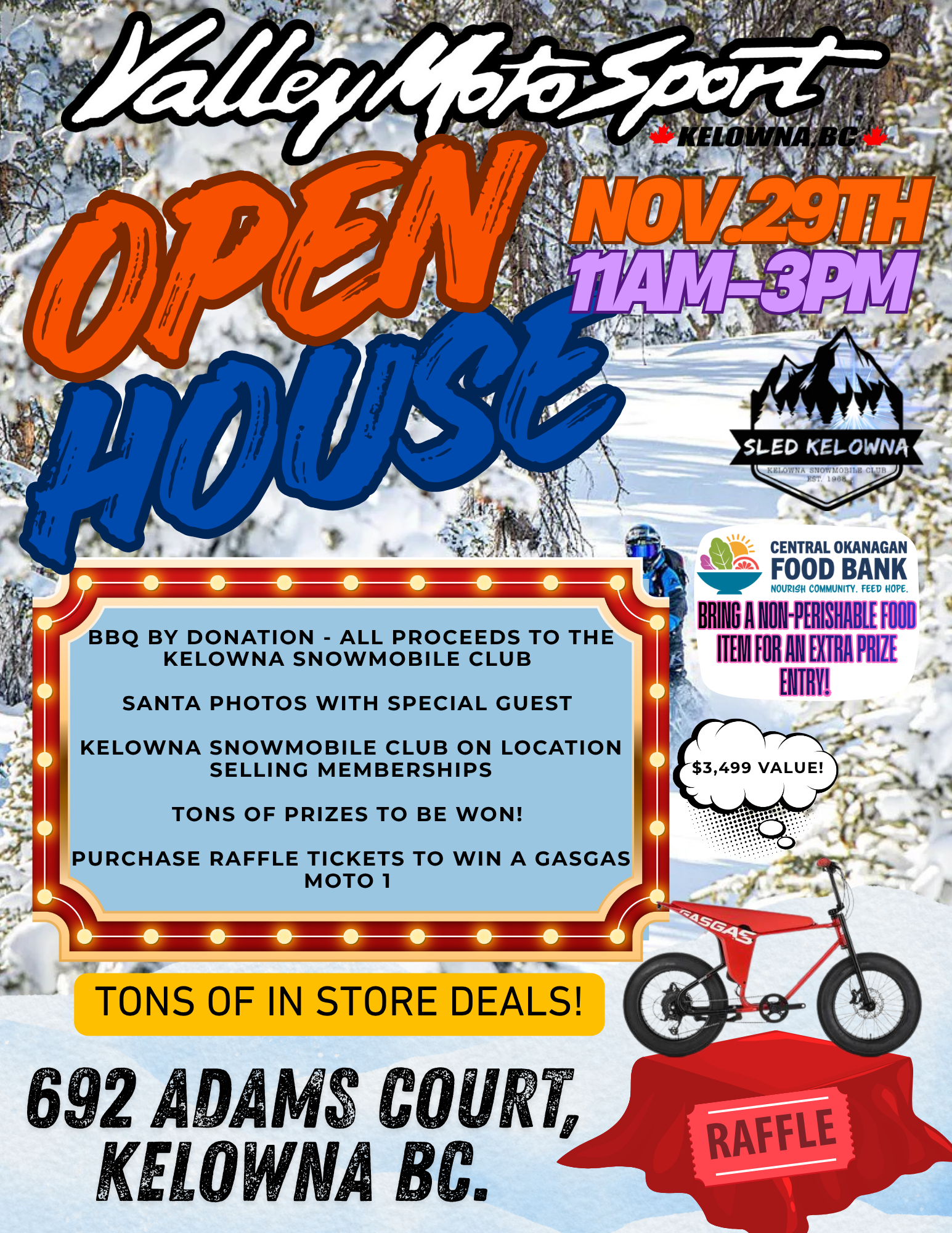 Join us for the Valley Moto-Sport Kelowna Open House on November 29th from 11AM–3PM!We’re celebrating the season with a fun-filled community event the whole family can enjoy. Enjoy a BBQ by donation, with all proceeds going directly to the Kelowna Snowmobile Club. The club will also be on-site selling memberships and answering any questions you