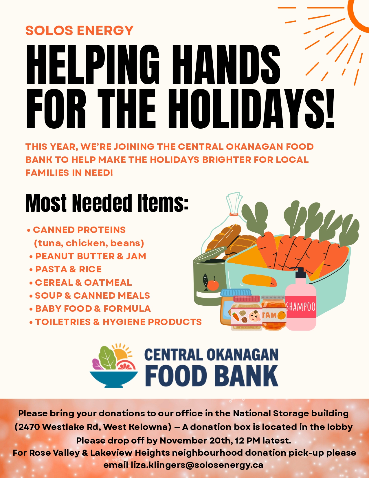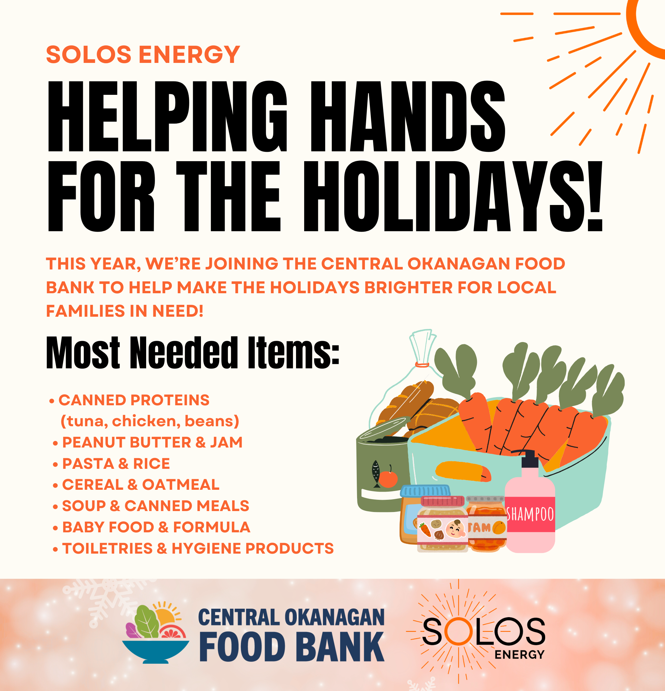 This season, Solos Energy is joining the Central Okanagan Food Bank to help make the holidays brighter for local families in need! We’re collecting non-perishable food donations, including canned proteins, peanut butter, pasta, rice, cereal, and other essentials. Drop off your donations at our office, located inside the National Storage building at 2470 Westlake Rd,