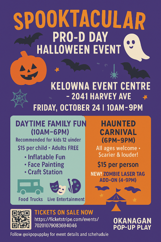 Get ready for an unforgettable Spooktacular Pro-D Day Halloween Event at the Kelowna Event Centre! Join us for a full day of family fun, spooky surprises, and thrilling entertainment all while supporting the Central Okanagan Food Bank. Daytime Family Fun (10 AM – 6 PM) Perfect for kids 12 and under!Enjoy: Inflatable Fun and Activity